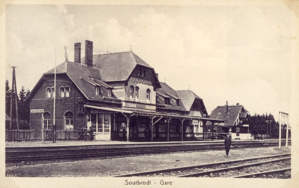BeschrijvingReproductie van een postkaart met als opschrift 'Sourbrodt - Gare'. De postkaart toont de achterzijde van het station, gefotografeerd van over de sporen.