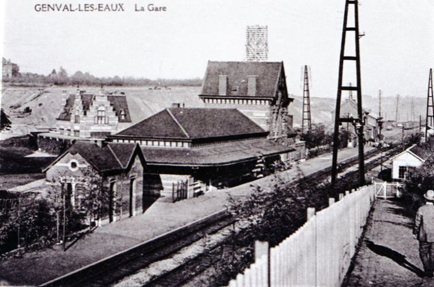 BeschrijvingReproductie van een postkaart met als opschrift 'Genval-Les-Eaux La Gare'. De postkaart toont de achtergevel met brede luifel van het station, gefotografeerd van over de sporen.
