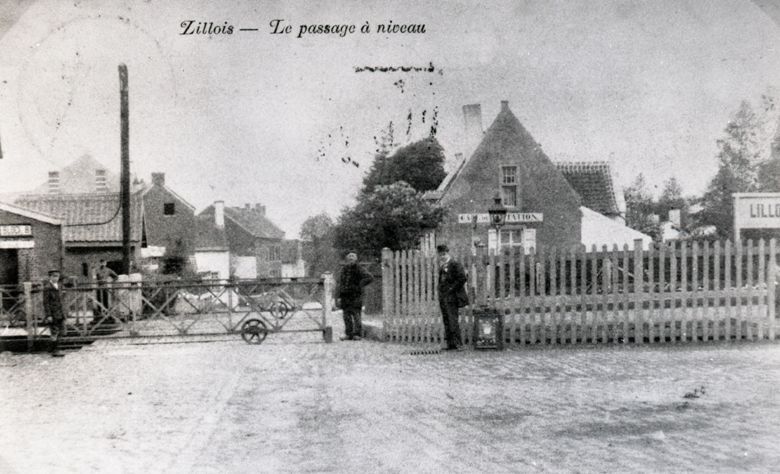 BeschrijvingReproductie van een postkaart met als opschrift 'Lillois Le passage à niveau'. De postkaart toont een gesloten overweg met rolbareel. Personeel en voorbijgangers poseren bij de overweg.