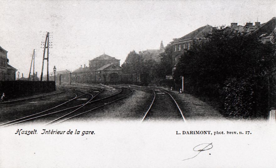 Reproductie van een postkaart met als opschrift 'Hasselt. - Intérieur de la Gare. L. Darimont, phot. brev. n.17.' De postkaart toont de sporen die naar het station lopen. Aan twee perrons staan goederentreinen. Onderaan de kaart staat een handtekening.
