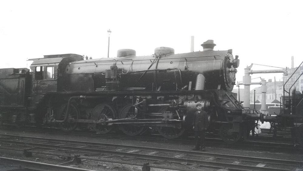 Deze stoomlocomotief behoort tot het type 38 (1D Consolidation). De foto toont de rechterzijde van de locomotief en een stuk van de tender. Op de achtergrond bevinden zich twee waterkolommen.