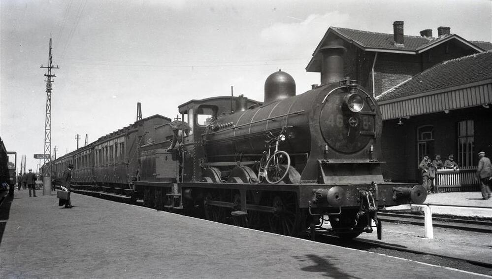 Deze stoomlocomotief behoort tot het type 44 (C Bourbonnais). De rijtuigen zijn van Duitse origine. De foto toont de rechterzijde van de locomotief, waar een fiets op staat. Achter de reizigerstrein bevindt zich het stationsgebouw van de douane en enkele douanebeambten. Op het perron staan enkele reizigers en een stationsnaambord 'Selzaete'.