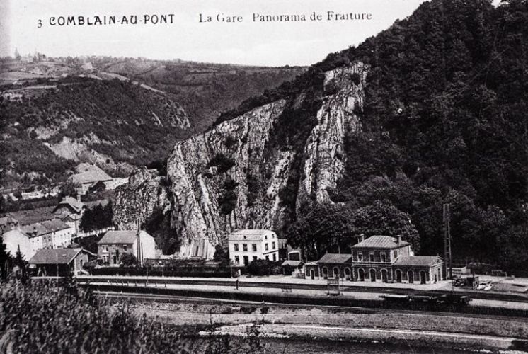 BeschrijvingReproductie van een postkaart met als opschrift '3 Comblain-au-Pont La Gare, Panorama de Fraiture'. De postkaart toont het station, de perrons en de sporen ten midden van een typisch Ardeens landschap.
