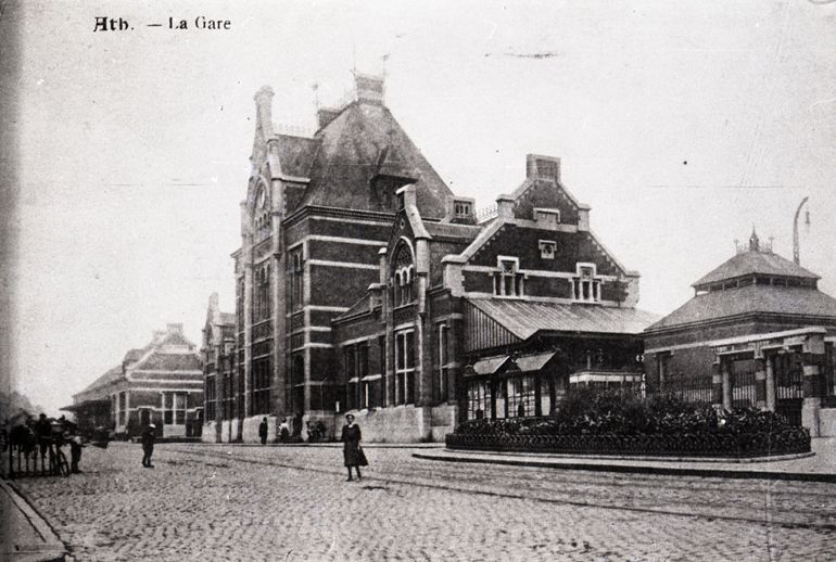 BeschrijvingReproductie van een postkaart met als opschrift 'Ath. - La Gare'. We zien de zij- en voorgevel van het station. Op de straat poseren enkele personen.