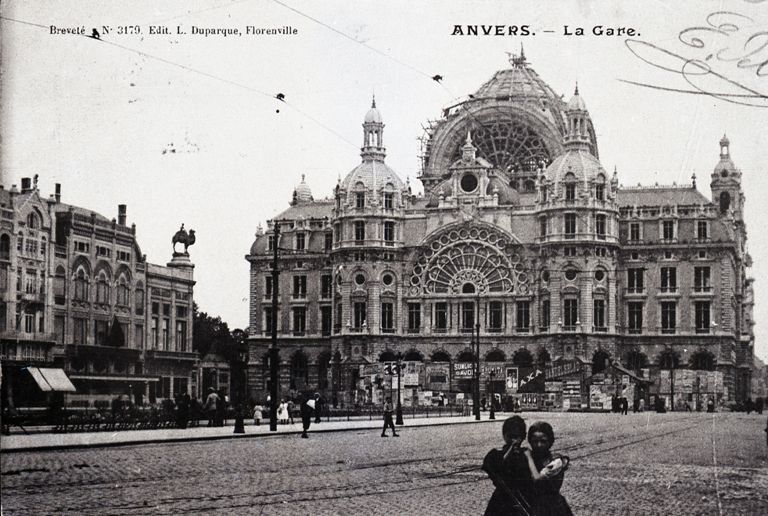 Reproductie van een postkaart met als opschrift 'Anvers. - La Gare. Breveté N. 3179. Edit. L. Duparque, Florenville'. De postkaart toont de voorgevel van het station en het plein met voorbijgangers. Rechtsbovenaan staat een handtekening.