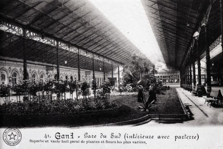 Reproductie van een postkaart met als opschrift '41. Gand - Gare du Sud (intérieure avec parterre) Superbe et vaste hall garni de plantes et fleurs les plus variées.' Op de postkaart is de binnentuin te zien die rond 1900 werd ingericht in de vrijgekomen sporenhal van het station Gent-Zuid.