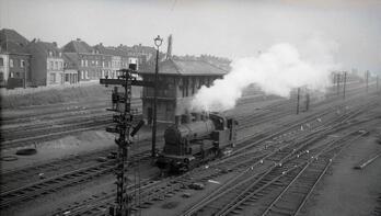 BeschrijvingEen stoomlocomotief van het type 91 (Dt) rijdt voorbij de seinpost in Moeskroen. In de voorgrond zien we een mechanische seinpaal, in de achtergrond een rij huizen.