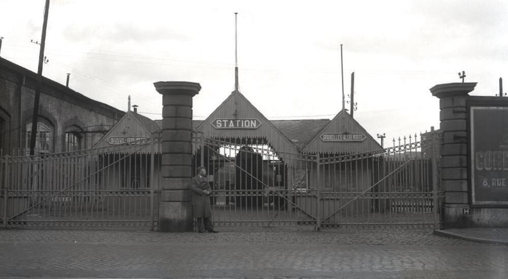 BeschrijvingDeze foto toont de straatzijde van het houten stationsgebouw van Brussel-Groendreef. Voor het gebouw bevindt zich een gesloten ijzeren hek.