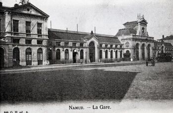 BeschrijvingReproductie van een postkaart met als opschrift 'Namur. - La Gare. 444. G.H.ed.A.' De kaart toont de voorgevel van het station. Uiterst rechts zien we een tram op het stationsplein.