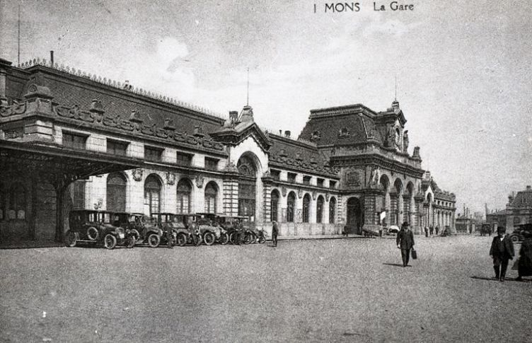 BeschrijvingReproductie van een postkaart met als opschrift '1 Mons La Gare'. We zien de voorgevel van het stationsgebouw. Op het stationsplein staan enkele geparkeerde auto's en lopen er voorbijgangers.