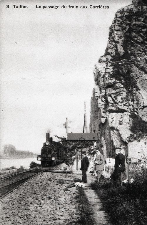 Reproductie van een postkaart met als opschrift '3 Tailfer. Le passage du train aux Carrières'. De foto toont de neus van een stoomlocomotief op een spoorlijn langs de Maas. Verschillende mannen staan naast de spoorlijn te wachten. Achter hen zien we een diensthuisje en een mechanische seinpaal.