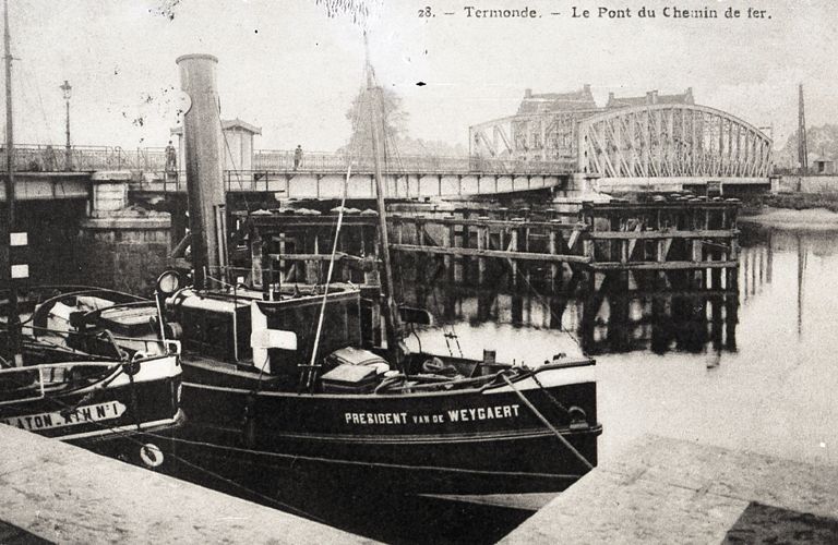BeschrijvingReproductie van een postkaart met als opschrif '28. - Termonde. - Le Pont du Chemin de fer.' De postkaart toont een brug over de Schelde. Aan de kade ligt een stoomboot.