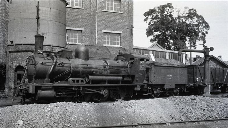 Deze foto toont de linkerzijde van een stoomlocomotief van de 'Compagnie de Chimay'. Later zou deze locomotief overgenomen worden door de NMBS en onderverdeeld worden bij het type 77 (D Eight Coupler). Op de achtergrond zien we een watertoren en een dienstgebouw. Rechtsvooraan staat een waterkolom.