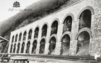 BeschrijvingReproductie van een postkaart met als opschrift 'Tilff. - Les Arcades.' We zien een spoorlijn die langs een dubbele arcade loopt.