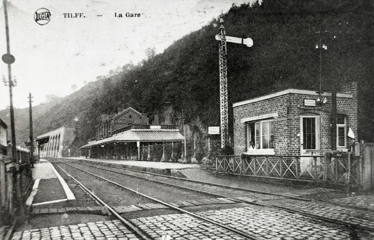 Reproductie van een postkaart met als opschrift 'Tilff. - La Gare'. We zien de zij- en achtergevel van het station, gefotografeerd vanop een overweg met rolbareel. Aan de overweg staat een wachthuisje en een mechanisch sein.