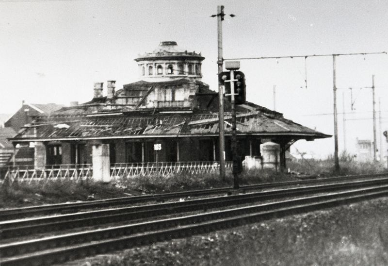 BeschrijvingReproductie van een postkaart zonder opschrift. De postkaart toont het vervallen station, gefotografeerd van over de sporen. Langs het spoor zien we een lichtsein.