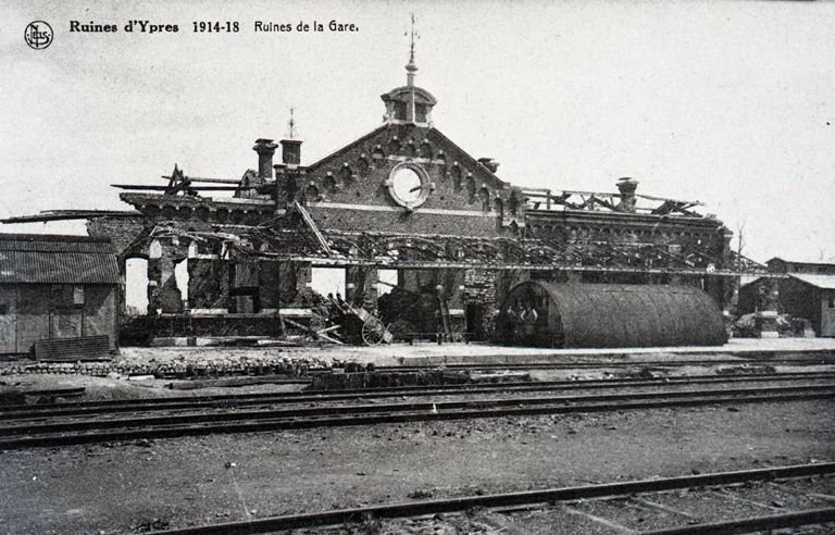 Postkaart van de ruïnes van het station Ieper