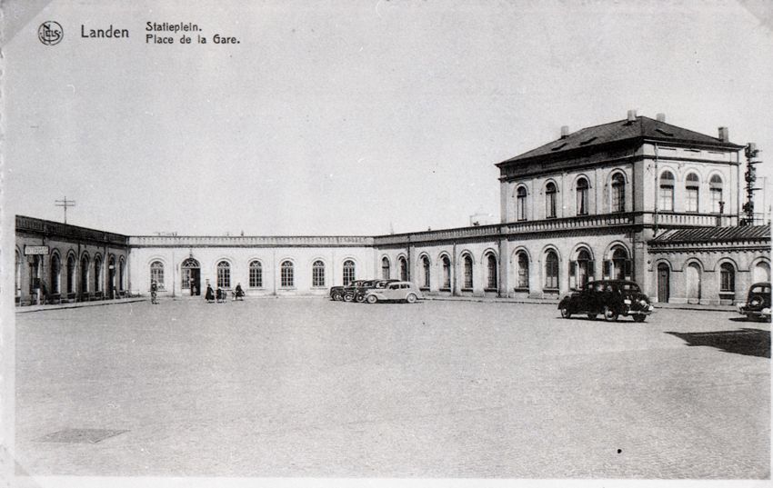 BeschrijvingReproductie van een postkaart met als opschrift 'Landen Statieplein. Place de la Gare.' De postkaart toont de voorgevel van het station en het stationsplein waarop enkele auto's staan.