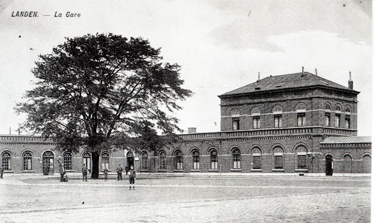 BeschrijvingReproductie van een postkaart met als opschrift 'Landen. - La Gare'. De postkaart toont de voorgevel van het station. Rond de boom op het stationsplein poseren verschillende voorbijgangers.