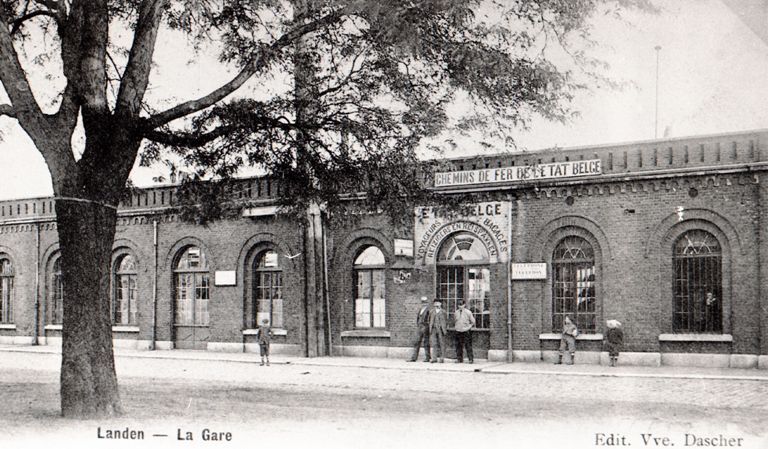 DescriptionReproduction d’une carte postale avec comme inscription “Landen - La Gare Edit. Vve. Dascher”. La carte postale illustre la façade principale de la gare. Quelques personnes posent devant l’entrée.
