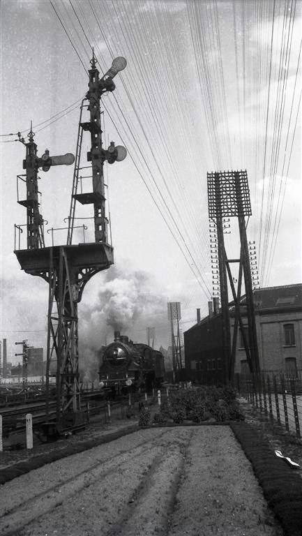 Op deze foto zien we de voorzijde van een stoomlocomotief behorende tot het type 66 (2B American). We zien ook een kandelaarsein, enkele mechanische seinpalen en telegraafpalen en -draden.