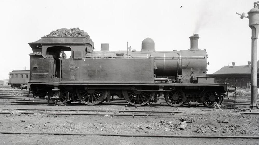 BeschrijvingDeze foto toont de rechterzijde van een tenderlocomotief die behoort tot het type 16 (2B1t). Rechts zien we een waterkolom en in de achtergrond de stelplaats.