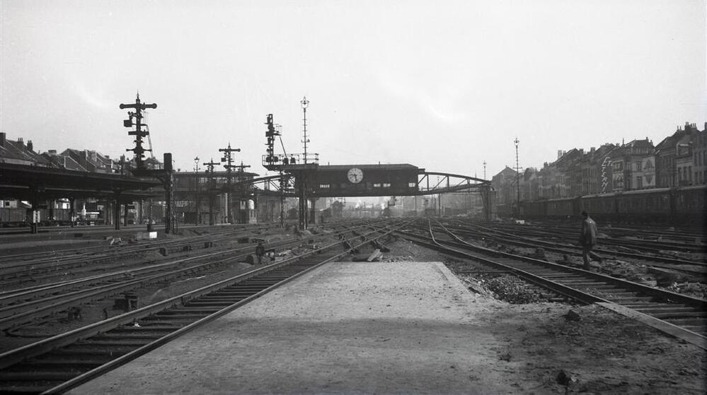 We zien het sporencomplex van Brussel-Noord met het unieke seinhuis dwars over de sporen en een grote klok. Ook is een deel van de perrons te zien, de wissels op het sporencomlex en verschillende kandelaarseinen tussen de sporen.