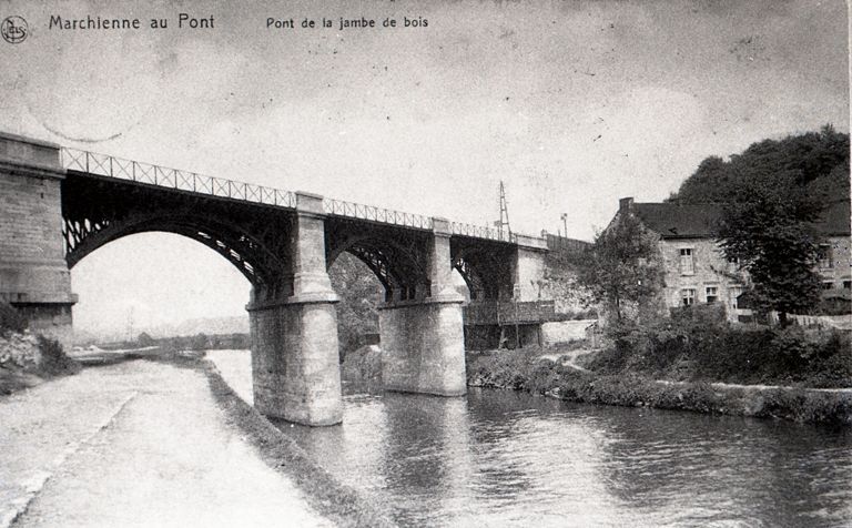 Reproductie van een postkaart met als opschrift 'Marchienne au Pont Pont de la jambe de bois'. De postkaart toont een metalen spoorwegbrug met drie bogen en stenen peilers over de rivier Samber.