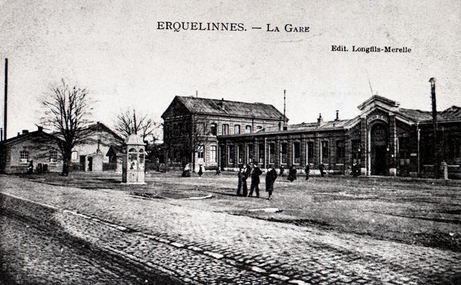 Reproductie van een postkaart met als opschrift 'Erquelinnes. - La Gare Edit. Longfils-Merelle'. De postkaart toont een deel van de voorgevel van het station. Op het stationsplein poseren enkele voorbijgangers.