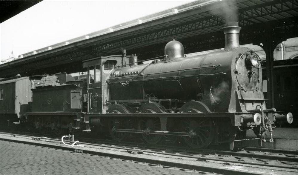 BeschrijvingWe zien een stoomlocomotief van het type 41 (C Bourbonnais) aan het perron van station Brussel-Zuid. We zien ook een deel van een GCI-bagagewagen en de perronoverkapping.