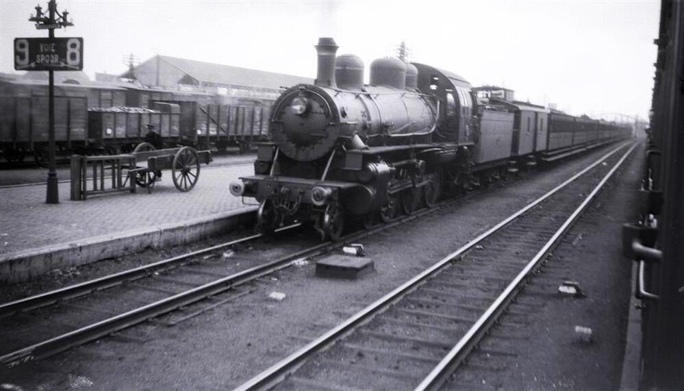 We zien een stoomlocomotief van het type 40 (2C Ten Wheel) en GCI-rijtuigen in het station van Kortrijk.Op de achtergrond staan enkele goederenwagens. Op het perron zien we een verlichtingspaal, een bagagekar en een bord met de perronnummering.