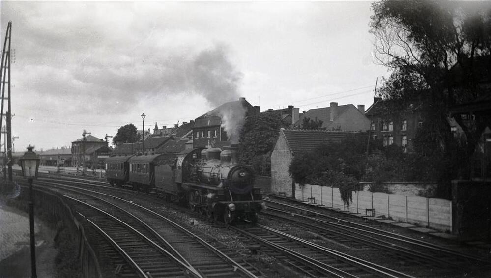 We zien een stoomlocomotief van het type 40 (2C Ten Wheel) en twee ex-Duitse rijtuigen, bij vertrek uit het station Hasselt. Ook zijn op de achtergrond het stationsgebouw en enkele mechanische seinen te zien.