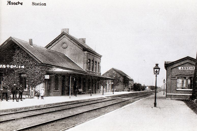 BeschrijvingReproductie van een postkaart met als opschrift 'Assche Station'. De postkaart toont de zij- en achtergevel van het station. Op het eerste perron poseert spoorwegpersoneel.