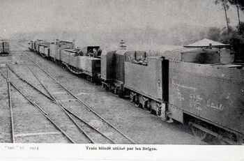 BeschrijvingReproductie van een postkaart met als opschrift 'Train blindé utilisé par les Belges. Geo. 55.-1914.' De postkaart toont een geblindeerde trein van het Belgische leger tijdens de Eerste Wereldoorlog.