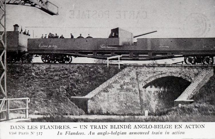 Reproduction d'une carte postale portant l'inscription «Dans les Flandres. - Un train blindé anglo-belge en action In Flanders. An anglo-belgian armoured train in action Visé Paris N° 517». On y voit un train blindé anglo-belge. Le canon de l’artillerie antiaérienne est bien visible.