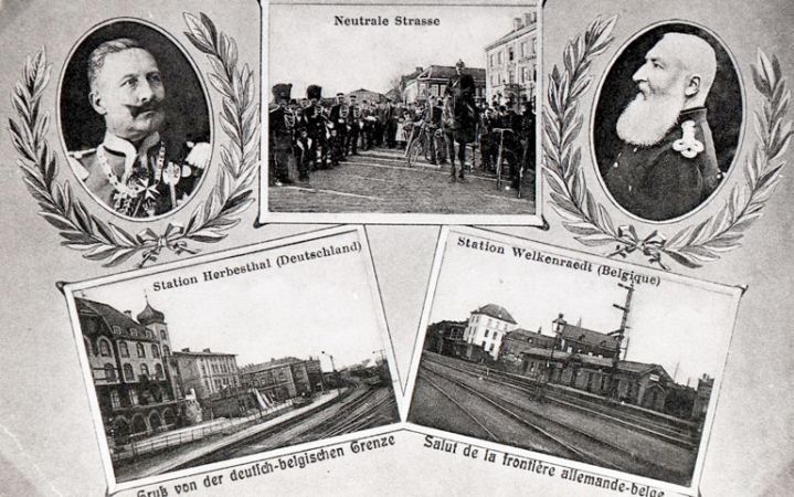 Reproductie van een postkaart met als opschrift 'Neutrale Strasse Station Herbesthal (Deutschland) Gruss von der deutch-belgischen Grenze Station Welkenraedt (Belgique) Salut de la frontière allemande-belge'. Deze postkaart combineert een foto van een groep Belgische en Duitse militairen met deze van de twee stations. In ovalen afgeboord met lauriertakken bevinden zich de portretten van de Duitse Keizer Wilhelm II en Koning Leopold II.