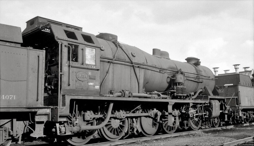 We zien een stoomlocomotief van het type 36 (1E Decapod) met nummer 3654. Aangezien de locomotief geen drijfstangen en ACFI-voorverwarmer meer heeft, is deze waarschijnlijk buiten dienst gesteld. Daarom heeft zij de NMBS-nummering van 1946 niet meer gekregen.