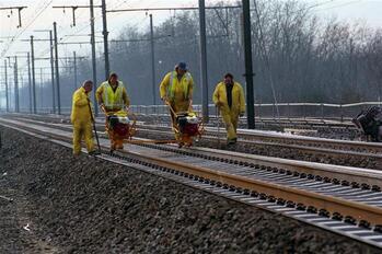 BeschrijvingDe groep bevat 110 negatieven.We zien spoorleggers aan het werk, een onderstopper, een toezichter en een werftrein met houten dwarsliggers.