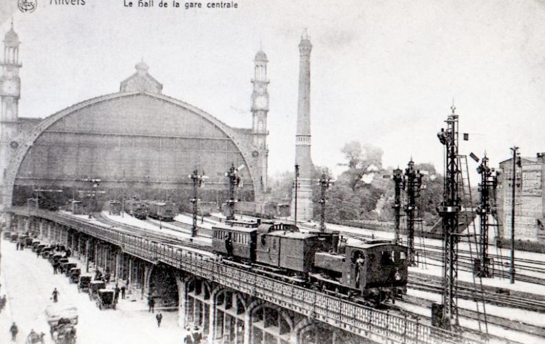 Reproductie van een postkaart met als opschrift 'Anvers Le hall de la gare centrale'. Deze postkaart toont een zicht op de gevel van de sporenhal. Op de sporen die naar de hal lopen duwt een stoomlocomotief type 51 een goederenwagen en een rijtuig. Langs deze sporen staan verschillende mechanische seinen. Op het straatniveau staat een rij auto's geparkeerd.