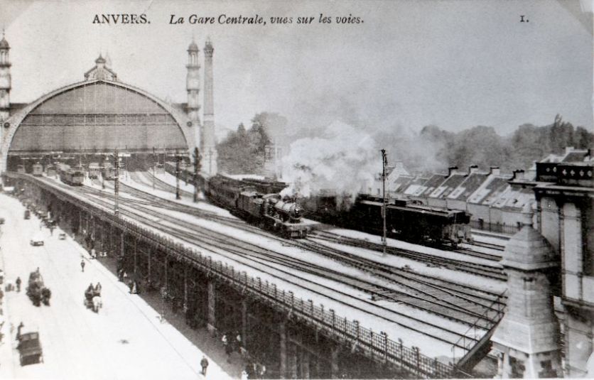Reproductie van een postkaart met als opschrift 'Anvers. La Gare Centrale, vues sur les voies. 1.' De postkaart toont een zicht op de achtergevel van de sporenhal. Op de sporen die naar de hal lopen staan meerdere reizigerstreinen. Langs deze sporen staan verschillende mechanische seinen. We zien ook auto's, koetsen en voorbijgangers op de straat naast de sporen.