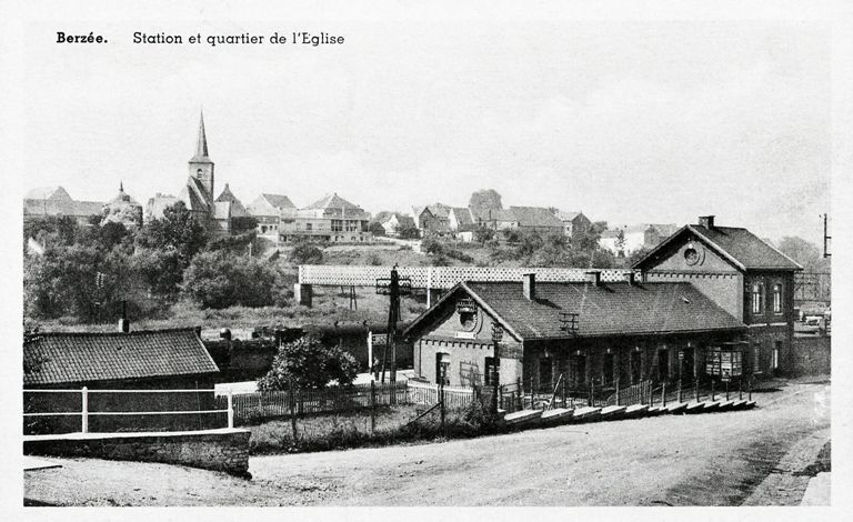 Reproductie van een postkaart met als opschrift 'Berzée. Station et quartier de l'Eglise'. De postkaart toont de zij- en voorgevel van het station. Over de sporen loopt een voetgangersbrug. Op de achtergrond zien we het dorp.