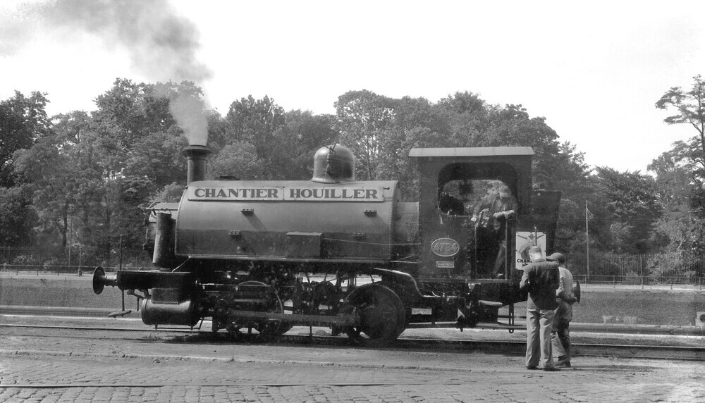 We zien een tenderlocomotief van het type 50 (Bt). Locomotief 4784 was een ex-NMBS stoomlocomotief die later in dienst was van de Kolenhandelaar Devis. Zij draagt het opschrift 'CHANTIER HOUILLER'. Deze locomotief is oorspronkelijk van Amerikaanse makelij. De machinist en stoker zijn aanwezig.