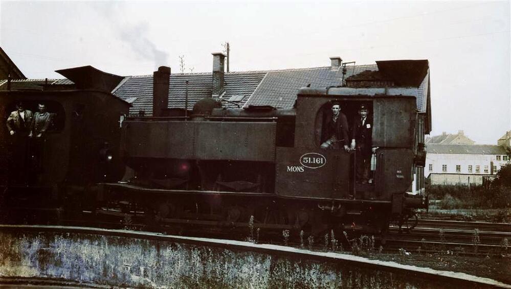 BeschrijvingWe zien een tenderlocomotief van het type 51 (Ct). Spoorwegpersoneel poseert in het machinistenhuis.