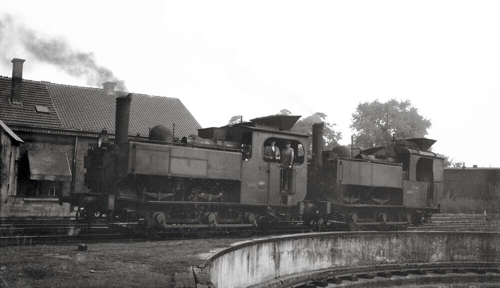 We zien twee tenderlocomotieven van het type 51 (Ct). Vooraan locomotief 51.161 en daarachter een locomotief waarvan we het nummer niet kunnen lezen. Beide staan naast een draaischijf. In de achtergrond staan dienstgebouwen.