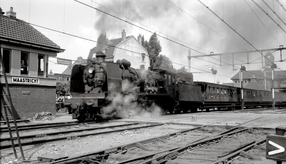 We zien een stoomlocomotief van het type 9 (2C Ten Wheel). Zij sleept GCI-rijtuigen die deel uitmaken van de reizigerstrein nummer 1022 of 1023. Links bevindt zich het seinhuis. Aan de bovenleiding te zien is de lijn reeds geëlektrificeerd.