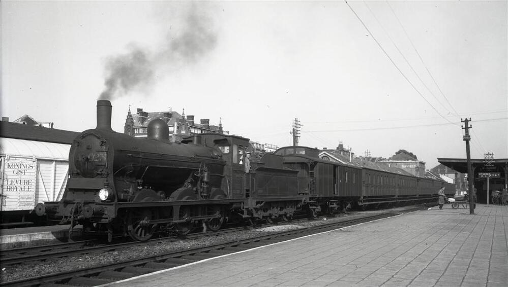 We zien een stoomlocomotief van het type 41 (C - Bourbonnais) die klaarstaat aan het perron om de reizigerstrein 3617 naar Mol te slepen. De trein is samengesteld uit locomotief 41.025, tender 13.265, een pakwagen en enkele GCI-rijtuigen. Op het perron zien we personeel met een bagagekar. Links is een goederenwagen met het opschrift 'Konings Gist Levure Royale' te zien.