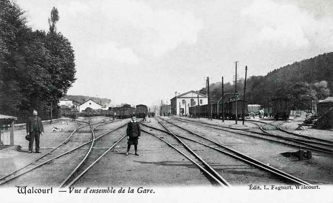 Reproductie van een postkaart met als opschrift 'Walcourt. - Vue d'ensemble de la Gare. Edit. L. Fagnart, Walcourt.' De postkaart toont de sporenbundel, waarop verschillende goederenwagens staan. Op de achtergrond is de zijgevel van het station zichtbaar. Op de voorgrond poseren twee personen.