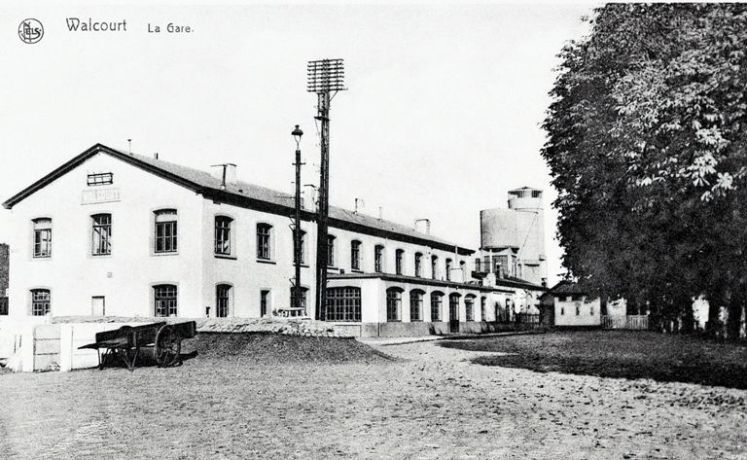 Reproductie van een postkaart met als opschrift 'Walcourt La Gare.' De postkaart toont de voorgevel van het station met ervoor een mast voor telegrafie. Op de achtergrond zien we een watertoren.