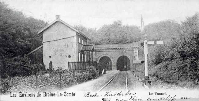 Reproductie van een postkaart met als opschrift 'Les Environs de Braine-Le-Comte Le Tunnel.' De postkaart toont de zuidelijke ingang van de tunnel, met twee kokers, waarvan slechts één in dienst was. De linkse koker was tijdens het bouwen in 1840-'41 immers ingestort. Links staat een gebouw. Op de voorgrond rechts zien we een mechanische seinpaal. Onderaan de kaart staat een handgeschreven boodschap.