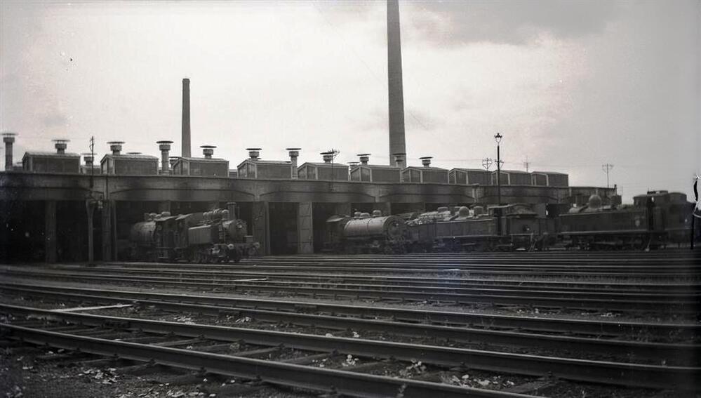 Zicht op de locomotiefloods van Schaarbeek met diverse stoomlocomotieven